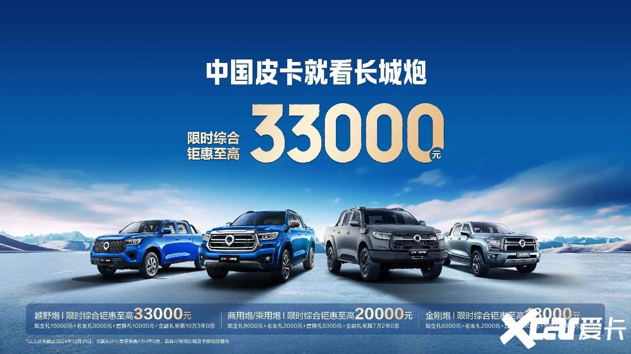 为感恩回馈广大用户的支持与信赖,长城炮品牌年终钜惠活动强势来袭,即日起至12月31日,购买长城炮旗下车型享限时综合钜惠至高33000元。