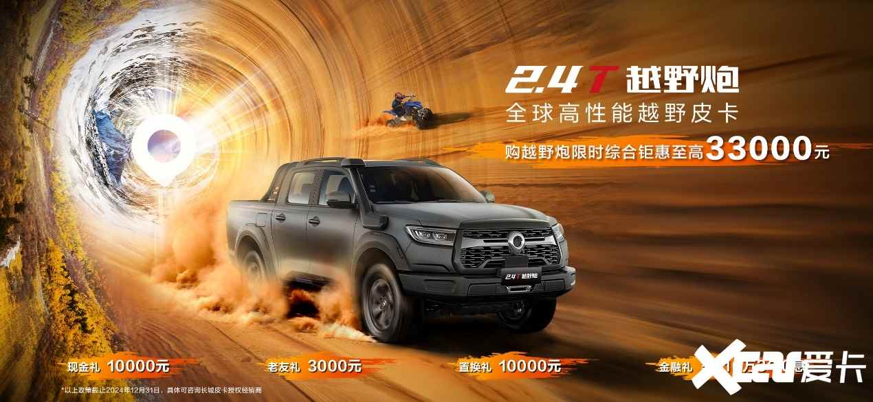 现在购买越野炮,限时综合钜惠至高33000元,尊享10000元现金礼、3000元老友礼(长城车主增购/换购及其他品牌皮卡车主换购可享)、10000元置换礼、至高10万3年0息金融礼等豪礼。