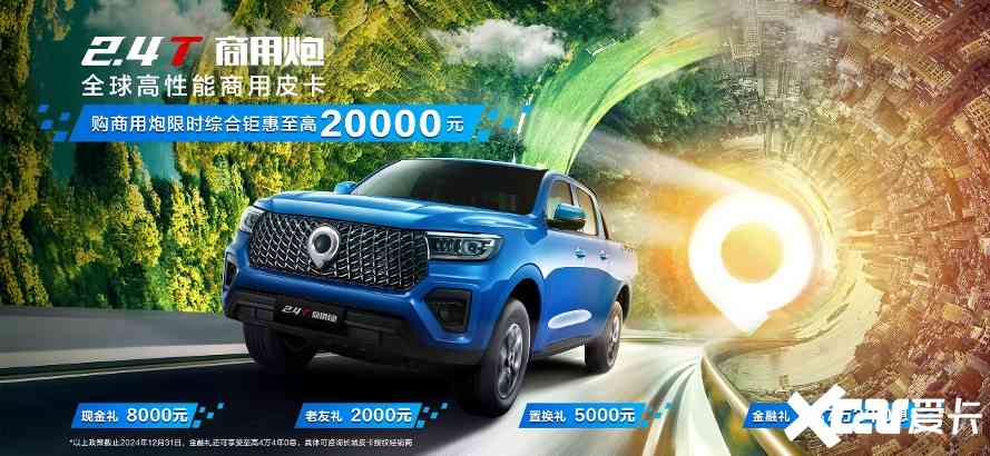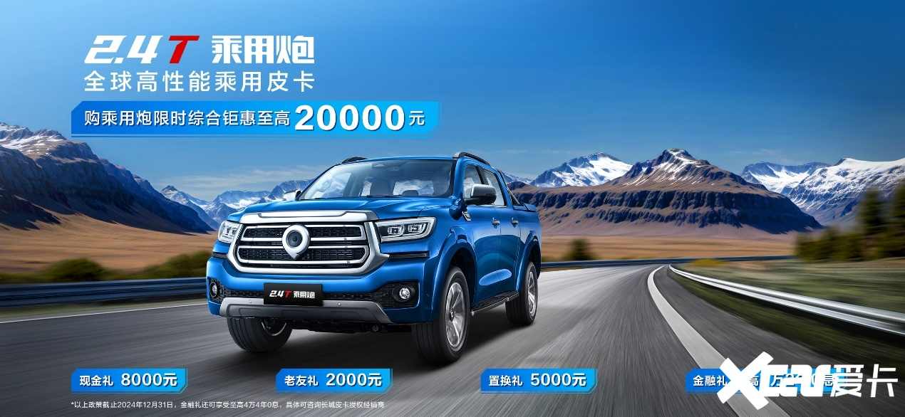购买乘用炮、商用炮,限时综合钜惠至高20000元,尊享8000元现金礼、2000元老友礼(长城车主增购/换购及其他品牌皮卡车主换购可享)、5000元置换礼、至高7万2年0息/4万4年0息金融礼等豪礼。