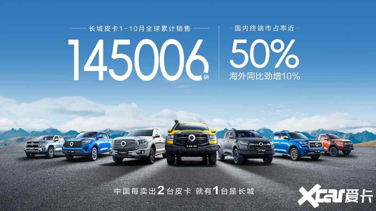 1-10月,长城皮卡全球累计销售145006辆,国内终端市占率近50%,中国每卖出两台皮卡,就有一台是长城。1-10月海外累计销售41934辆,同比增长10%,其中10月销售4422辆,同比劲增17%。