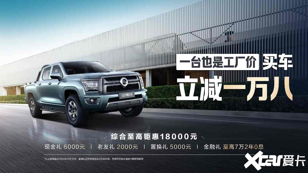 购买金刚炮,限时综合钜惠至高18000元,尊享6000元现金礼、2000元老友礼(长城车主增购/换购及其他品牌皮卡车主换购可享)、5000元置换礼、至高7万2年0息/4万4年0息金融礼等豪礼。