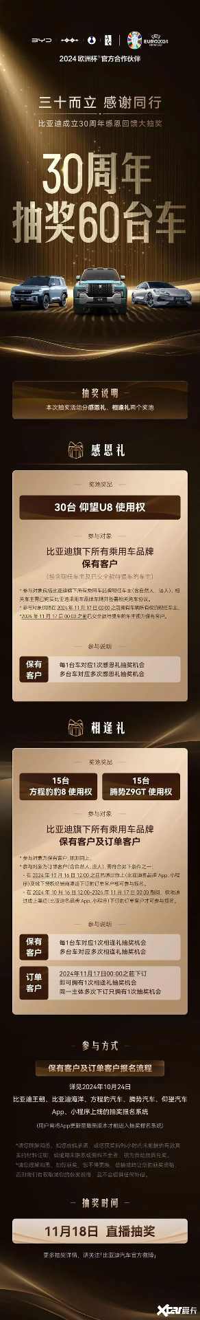 对于关于此次抽奖活动的详细规则,有很多网友非常关心,为了解答大家都疑惑,我们整理了一份比亚迪30周年大抽奖的详细参与规则,请大家查收。关于本次抽奖的详细规则也可在报名系统的规则页面中仔细阅读。