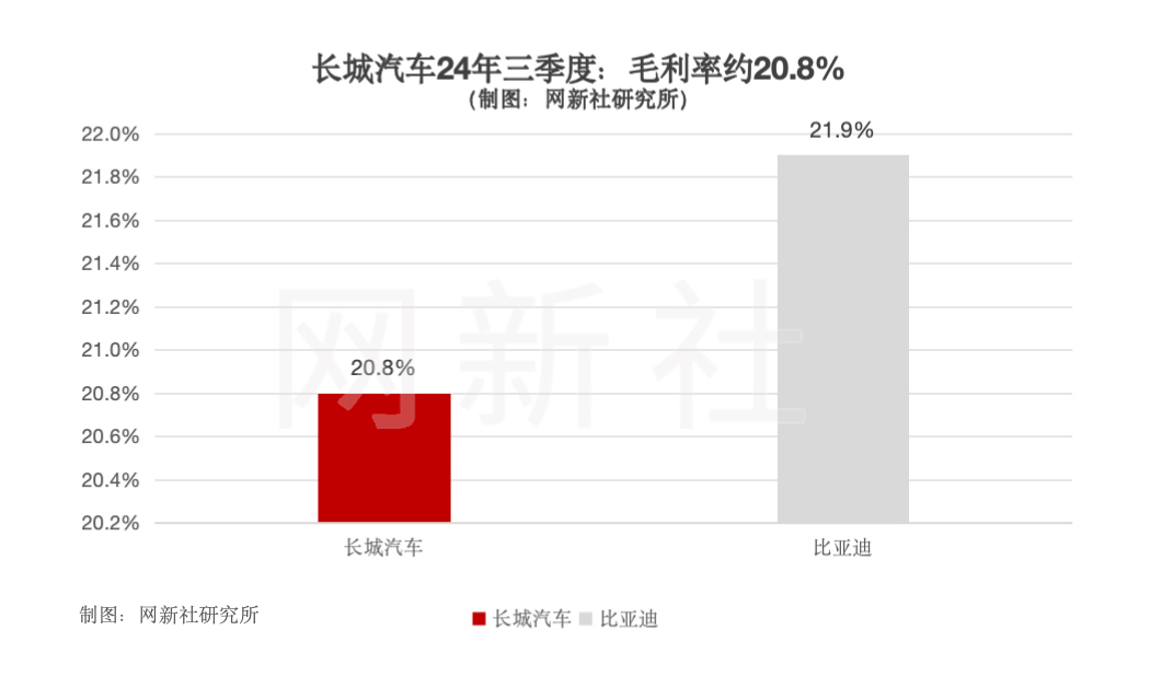 24年三季度,长城汽车毛利率和净利率分别为20.8%和6.6%,同比下滑0.9%和0.7%,相较于二季度也出现负增长,分别为-0.6%和-0.7%。