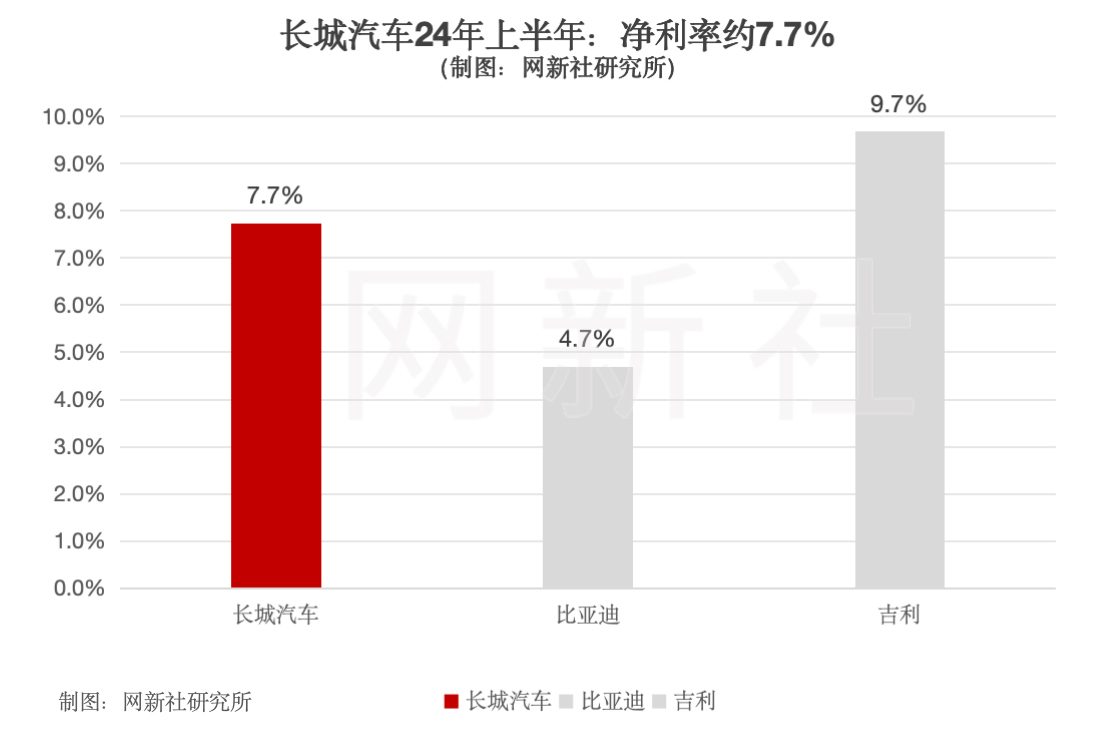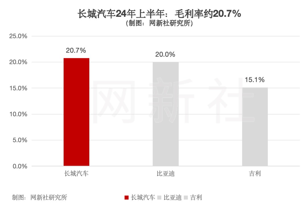 截止24年上半年,长城汽车毛利率和净利率分别为20.7%和7.7%,优于比亚迪20%和吉利15%的毛利率,净利率亦优于比亚迪的4.7%,稍逊于吉利9.7%的净利率水平。