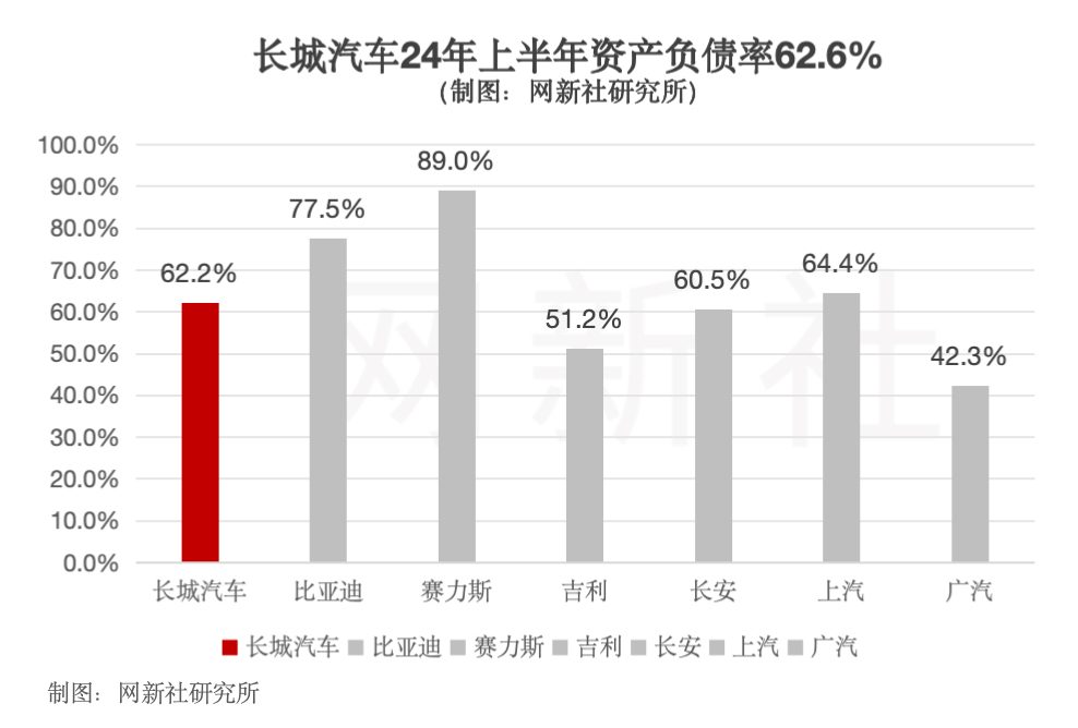 截止24年前三季度,长城汽车总资产为2043.71亿元,负债总额为1270.31亿元,资产负债率为62.2%,二季度的数据则为62.7%,优于赛力斯/比亚迪/上汽的89.0%/77.5%/64.4%,但相较于广汽/吉利/长安的42.3%/51.2%/60.5%,仍存在较高的偿债压力。