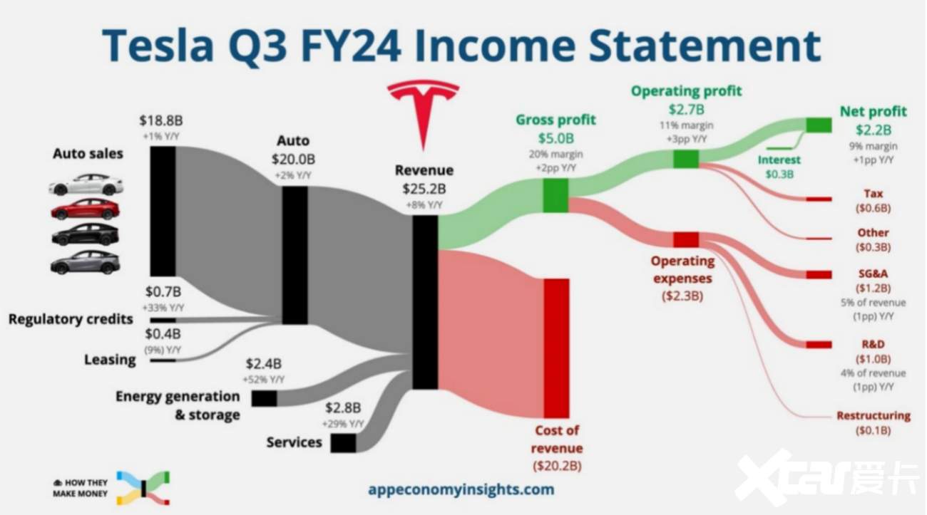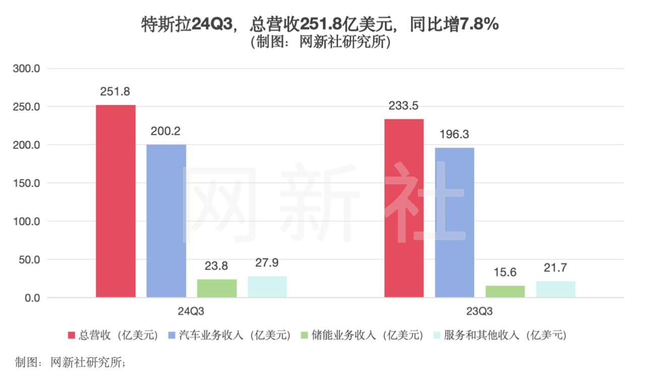 财报显示,特斯拉24年三季度总营收251.8亿美元,略低于市场预计的254.3亿美元,单季度营收比去年同期增长7.8%,但环比二季度255.0亿美元,下降约1%。