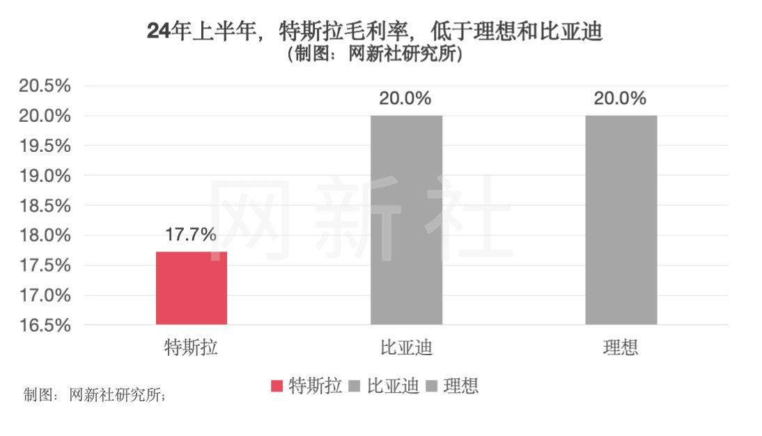 特斯拉三季度毛利率为19.8%,较二季度有所改善,但仍大幅低于22年的同期的26.6%。同时,24年上半年的毛利率,特斯拉亦低于比亚迪和理想20%的毛利率。