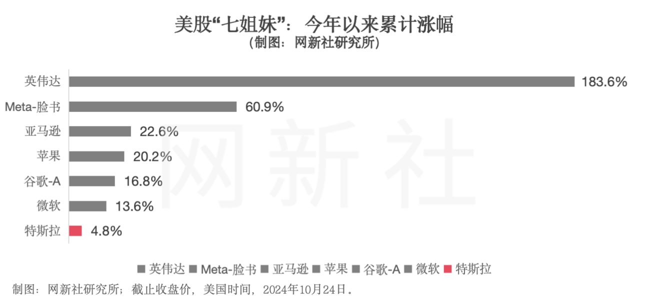 财报公布后,特斯拉股价收涨21.92%,创近十一年来最大单日涨幅,马斯克身价也一日爆涨260亿美元。大涨之后,特斯拉今年的涨幅,依然是美股“七姐妹”中,表现最差的公司。