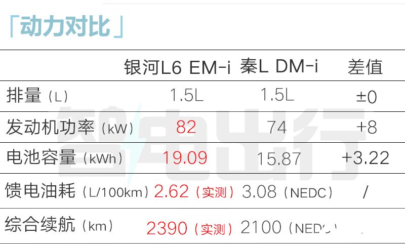 比亚迪秦L DM-i上市时首搭第5代DM-i混动,亏电油耗2.9L/100km,综合续航里程2100km,官方称其为“工业奇迹”。银河L6 EM-i拥有更低的油耗和更强的续航。