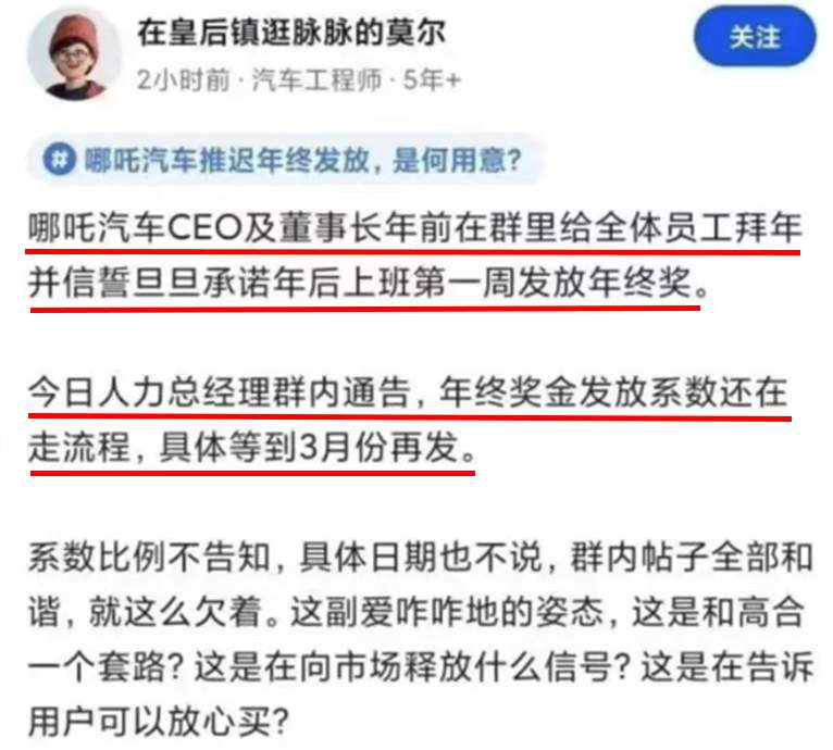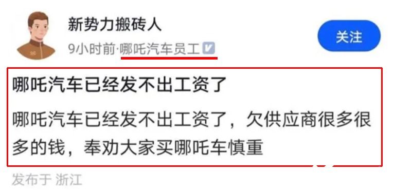 10月16日,一位认证为“哪吒汽车员工”的网友在社交媒体发文称,公司已经发不出工资了,欠供应商很多很多的钱,奉劝大家买哪吒车慎重!