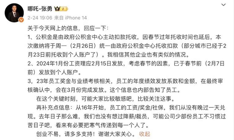这已不是哪吒汽车第一次传出拖欠工资。今年2月,该公司员工自曝年终奖没有按时发放,张勇随后在微博进行了公开回应。