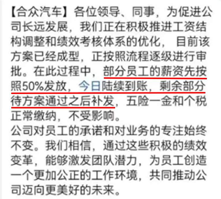 网上还出现了一张疑似哪吒汽车内部工作群的截图,大致意思是:公司正在调整工资结构和优化绩效考核体系,方案尚在审批。部分员工的薪资,先按50%发放,走完流程后,补发剩余部分。