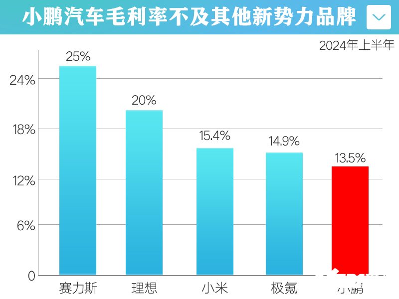 小鹏目前的产品布局依旧是主打10-20万价格区间,今年上半年汽车毛利率13.5%。作为对比,赛力斯和理想分别达到25%、20%,小米和极氪也达到了15.4%、14.9%。与其他新势力车企相比,小鹏的毛利率依然处于相对较低的水平。