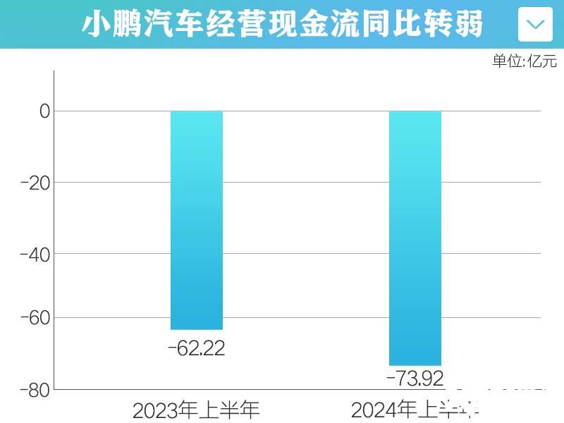 小鹏今年上半年的经营现金流为-73.92亿元,比去年同期-62.22亿元状况更糟,显示出公司的现金流状况仍需改善。