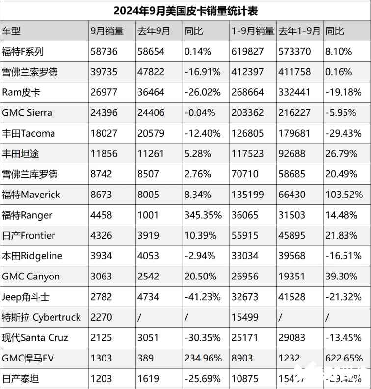 写在最后:9月美国皮卡销量达到222606辆,同比微跌6.08%。1-9月,美国皮卡累计销量达到2199578辆,同比微增2.08%。如此大体量的皮卡市场,仍能在今年保持增长,确实令其他皮卡市场羡慕不已。