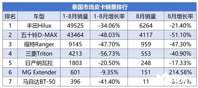 其它车型方面,来自国产品牌的MG Extender今年1-8月售出601台,同比下滑9.35%,但需要注意的是,该车8月单月售出151台,相比去年8月的80台同比上涨214.58,也是8月唯一一款销量上涨的车型,体现出国产皮卡正在逐步受到泰国用户青睐。除此之外,与五十铃D-MAX同根同源的马自达BT-50销量尤为惨淡,1-8月售出396台下滑41.4%,8月单月更是仅售出11台,同比下滑81.97%,按照这一销量势头,马自达BT-50或许未来会退出泰国市场。