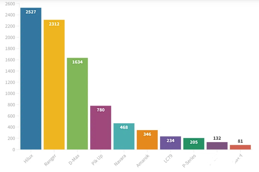 因此,福特Ranger以2312辆再次屈居第二,它与第一名的丰田Hilux差距缩小到215 辆。在这些销量中,有178辆来自于政府采购。福特Ranger上个月的销量为2258辆,其实环比反而是增长的。所以福特Ranger从这方面来讲,本月比丰田Hilux表现更好。