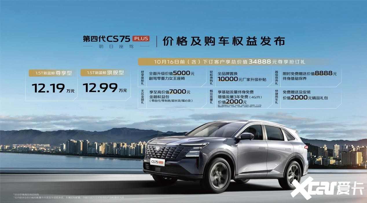 9月24日,长安汽车第四代CS75PLUS正式发布价格及购车权益,提供两款车型选择,其中1.5T新蓝鲸尊享型12.19万元,1.5T新蓝鲸旗舰型12.99万元,先订先提!12月,长安汽车还将带来2.0T的动力选择。目前第四代CS75PLUS也已全国到店,并开放了用户试驾。